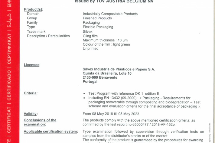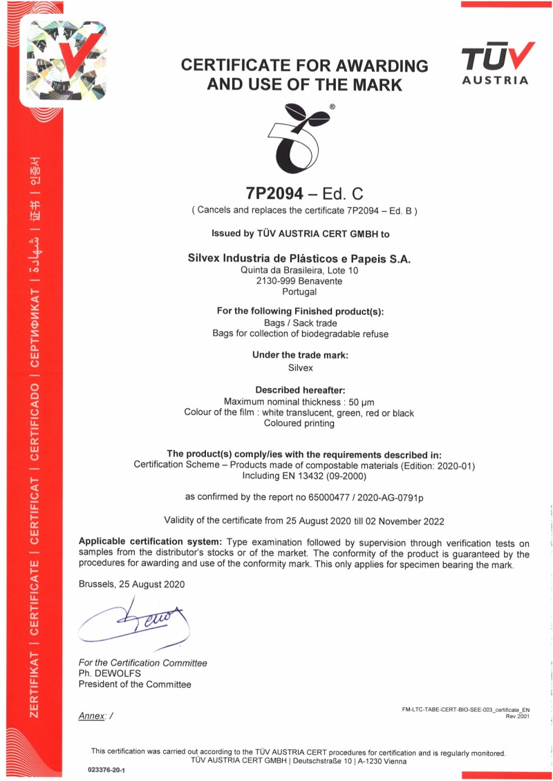 Esta certificação é uma marca registada pela European Bioplastics e prova que um dado artigo é compostável em ambiente industrial, de acordo com os requisitos da Norma Europeia 13432.